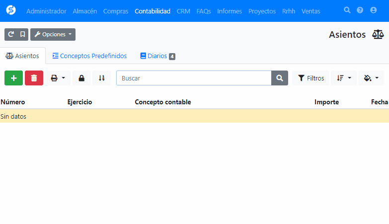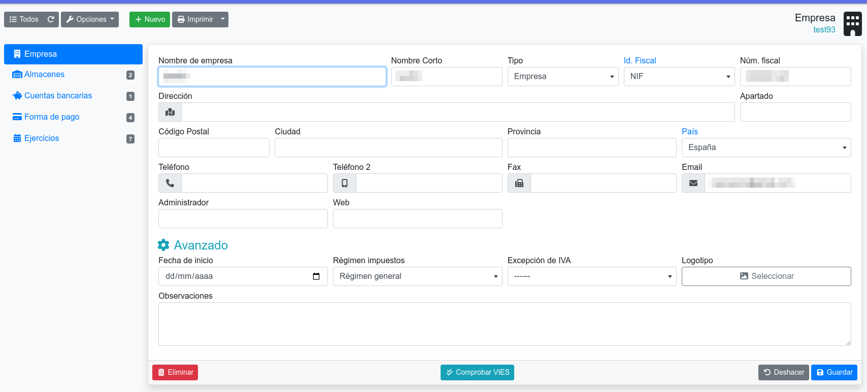 En este apartado registra la información de su empresa, además de subir su certificado de firma para la transferencia de facturas a la AEAT. También puede crear almacenes, añadir cuentas bancarias, formas de pago y ejercicios.